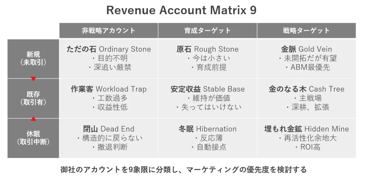 このフレームワークは、全顧客を「取引状態」と「戦略的重要度」という2つの軸で9象限に分類します。これにより、リソースを効果的に投下すべきアカウントを特定し、理想的な顧客像(ICP)を明確化します。どの顧客にどのようにアプローチするのか、戦略的ターゲットを再度設定することで、コスト対効果の高いマーケティングが実現します。