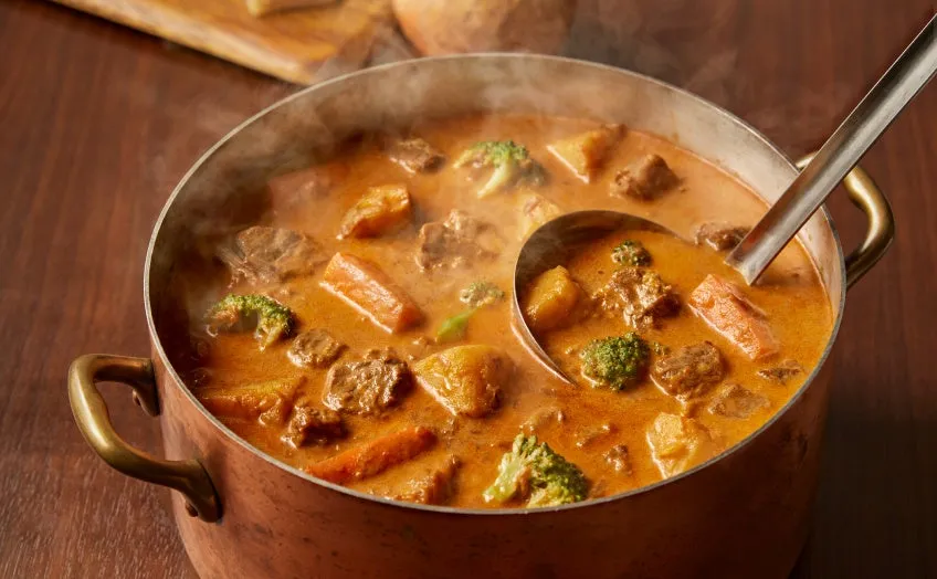 以下、各商品の概要をご紹介します。まずは「温野菜とチーズのブラウンシチュー」。こちらは、玉葱の甘みとミルク、チーズ、そして牛肉の旨味が絶妙に組み合わさった冬季限定の濃厚シチューです。また、豊富な温野菜がふんだんに盛り込まれており、健康や美容を気遣う方にも最適な一品。
