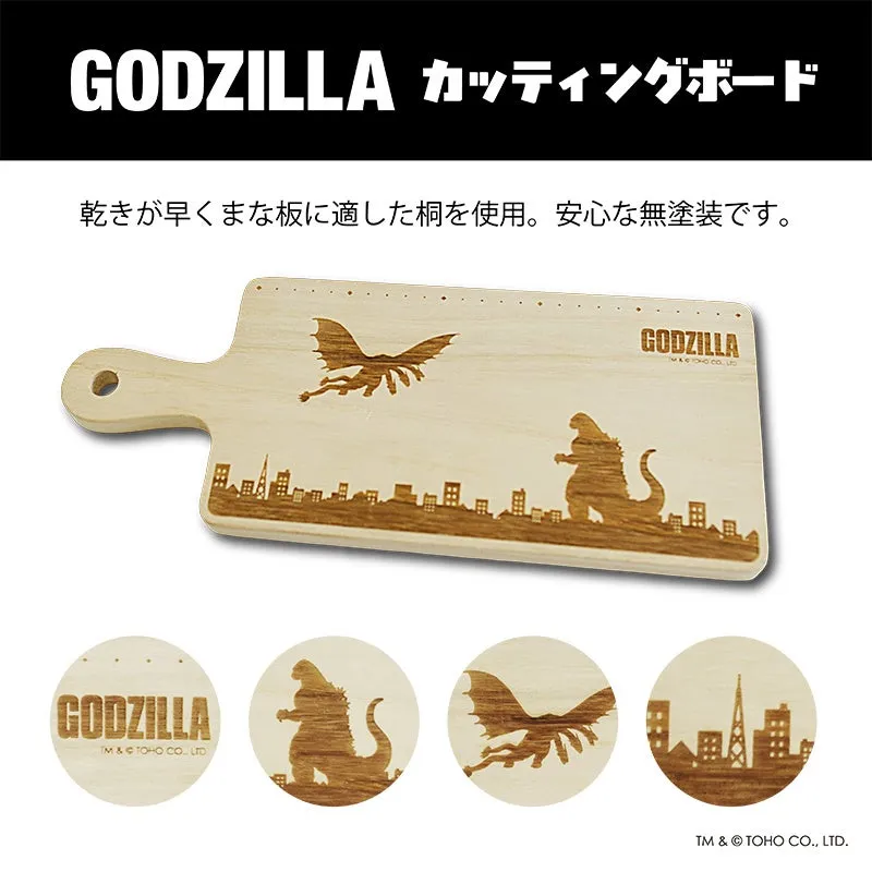 さらに、「ゴジラ」がデザインされた木製カッティングボードも同時に登場します。表面には、レーザー加工で描かれたゴジラとキングギドラの戦いの場面が表現されており、ナチュラルな木の質感と相まって、特別な食卓を演出してくれます。このカッティングボードは、調理中のまな板としての実用性だけでなく、プレート代わりとしても使用できるため、ゴジラファンにはたまらない一品です。