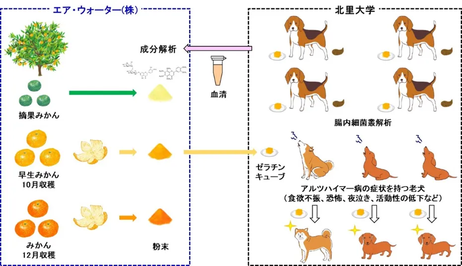 研究の中で、エア・ウォーターはさまざまな収穫時期におけるみかんの皮を利用し、そのフラボノイド成分の含有量を詳しく分析しました。特に注目されたのは、ヘスペリジンとノビレチンという2つの成分です。これらの成分が、実際に老犬の体内でどのように吸収され、腸内細菌にどのように影響を与えるのかを調査しました。