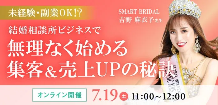 結婚相談所の開業を考えている方にとって、効率的な集客と売上アップの方法を学ぶことは非常に重要です。2025年7月19日、特別セミナーがオンラインで開催されます。これに参加することで、実践的なノウハウを手に入れ、事業を成功に導くための第一歩を踏み出しましょう。