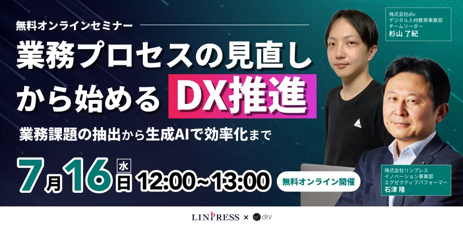 2025年7月16日に、株式会社リンプレスと株式会社divが共同で開催するウェビナー『業務プロセスの見直しから始めるDX推進 ~業務課題の抽出から生成AIで効率化まで~』に注目が集まっています。このウェビナーは、業務効率化を目指す企業にとって非常に有益な内容になることが予想されます。