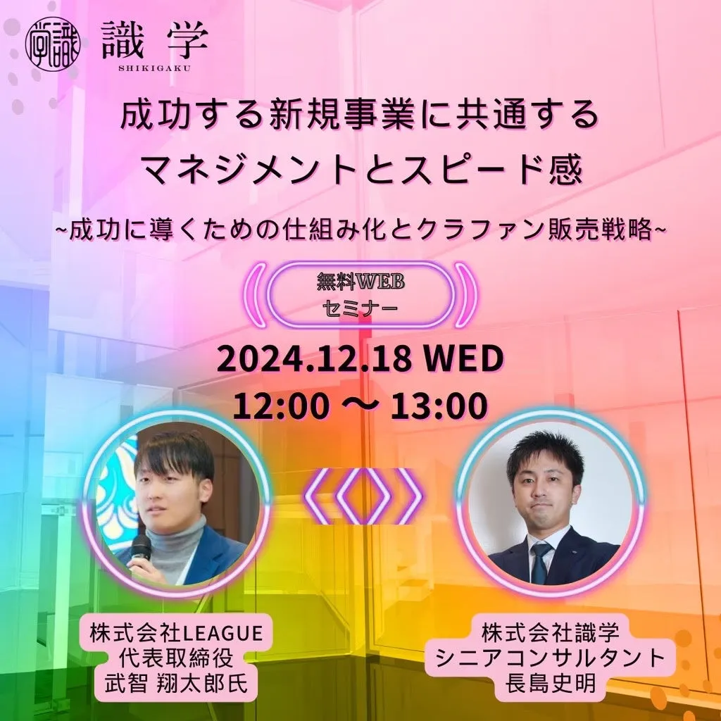 株式会社識学と株式会社LEAGUEが共催するオンラインセミナーが、2024年12月18日(月)に開催されます。このセミナーは、経営者や事業責任者向けに設計されており、新規事業の立ち上げやマネジメントに関心のある方には特に注目となるイベントです。