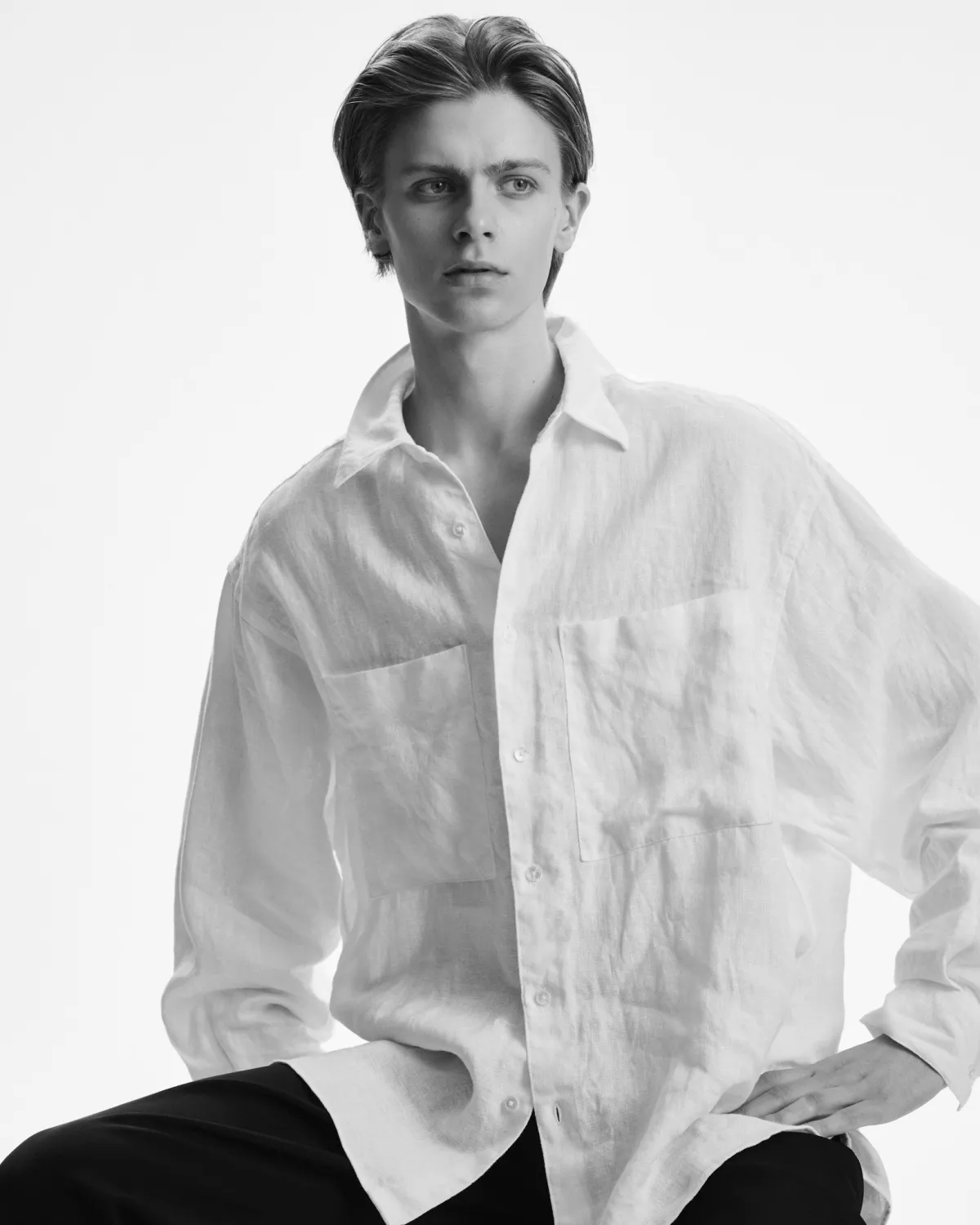 このリネンシャツは、昨年も人気を博したアイテムが再登場。サファリシャツをベースにしつつ、大きな胸ポケットデザインが特徴です。無骨さを和らげつつも、モダンな印象に仕上がっています。生地はしっかりとした打ち込みのあるリネンで、透け感を抑え、着心地も快適です。ゆったりとした身幅が風を通し、涼しさを感じさせてくれます。新たにブラックも加わり、コーディネートの幅が広がります。
