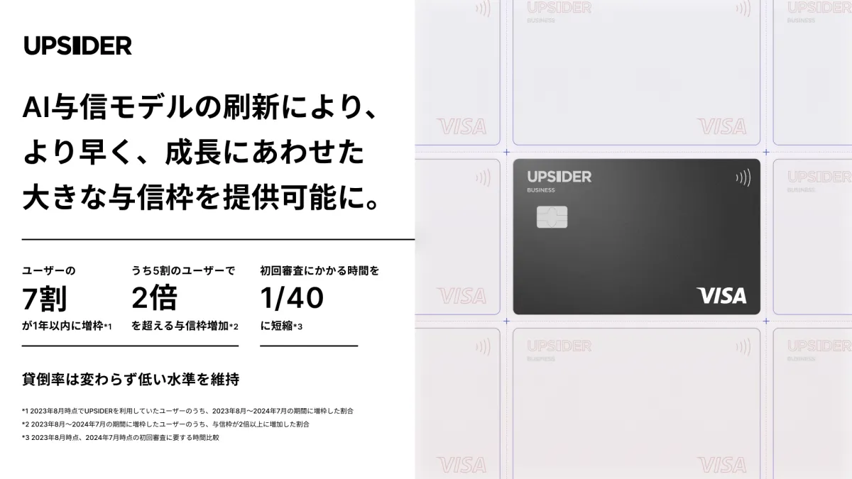 株式会社UPSIDERの法人カード「UPSIDER」は、AIの力を利用した革新的な与信技術の導入により、急成長する企業のニーズに応え続けています。多くの企業がこの新たな金融サービスを通じて、持続可能な成長を遂げることが期待されています。更なるサービスの拡充を通じて、日本経済の活性化に貢献していきたいと考えています。