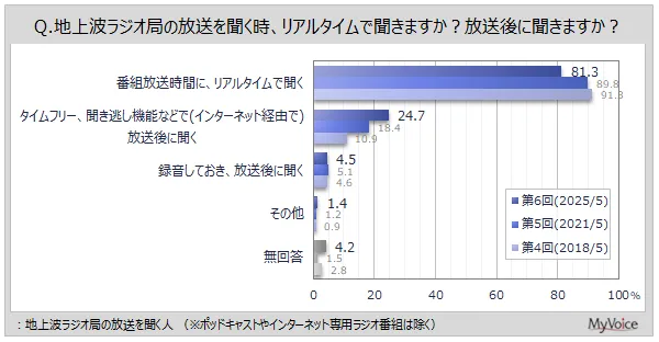 地上波ラジオ放送の聴取状況においては、81.3%がリアルタイムでの聴取を行い、放送後にタイムフリーや聞き逃し機能を利用する人は24.7%であり、過去の調査と比較して増加の傾向が見られます。特にインターネット経由でラジオを聴く層では、この数字が約60%に達し、年代ごとの聴取方法の差が徐々に広がっている印象を受けます。