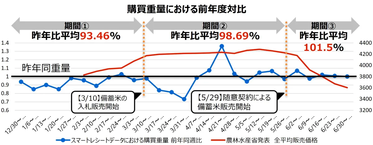 農林水産省の発表によると、2025年3月から開始された備蓄米の市場投入が、米価格の急騰を抑えるのに寄与しているとのことです。この取り組みの影響で、米の流通量の増加とともに価格が落ち着きを見せ、購買総量も前年同水準に達しています。本調査によると、価格安定化が購買量に与えた影響は顕著で、2025年3月からのデータでは、前年同期比で93.46%から始まり、5月には101.5%にまで回復しています。