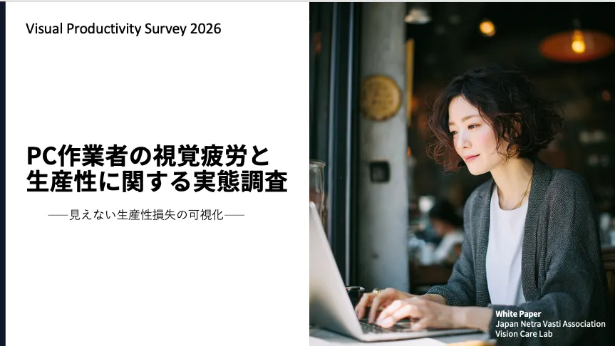ホワイトペーパーの中で触れられているように、視覚疲労には業務パフォーマンスの低下だけでなく、作環境(視距離、画面の高さ、照明)による影響も関連しています。例えば、適切な視距離や照明が整っていない環境では、視覚的ストレスが大きくなることがわかっています。このような問題を解決するためには、企業が視覚ケアの導入を進めることが求められています。