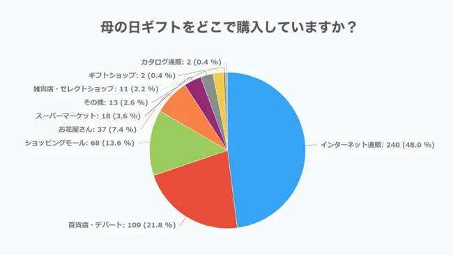 今年も母の日が近づいてきました。プレゼント選びの時期になると、多くの人がどこで母の日ギフトを購入するか悩むものです。「母の日ギフトをどこで購入したか?」という問いに対して、全国500名を対象に行ったアンケート調査の結果が発表されました。