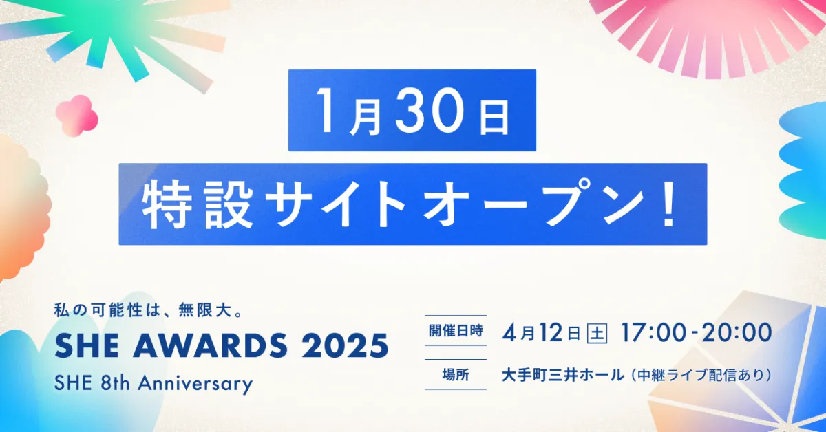 女性のキャリア支援を行う「SHElikes」を運営するSHE株式会社は、4月12日(土)に開催される「SHE AWARDS 2025」の特設サイトを1月30日にオープンしました。このイベントは、毎年行われ、自分らしく生きることをテーマに、多くの受講生の物語を表彰する祭典です。
