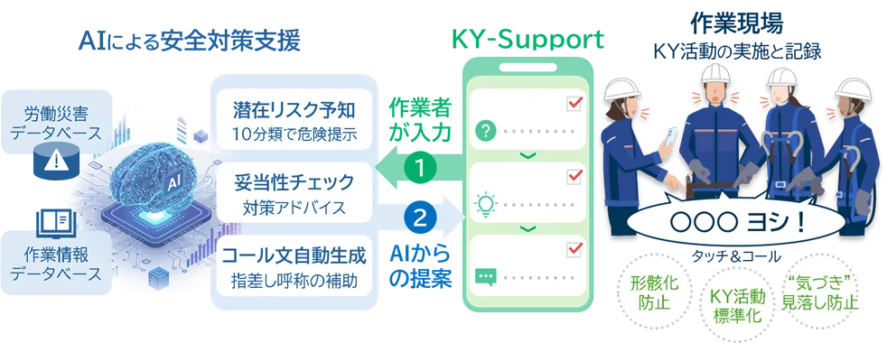 近年、労働災害の予防は企業にとっての最優先課題となっており、三菱電機は「安全及び品質最優先」の方針の下、重篤事故ゼロを目指して安全管理を強化しています。しかし、若手や経験の少ない作業者は潜在的なリスクを認識しづらく、ベテラン作業者はKY活動が形式的になりがちです。それらの課題をクリアするために「KY-Support」が開発されました。