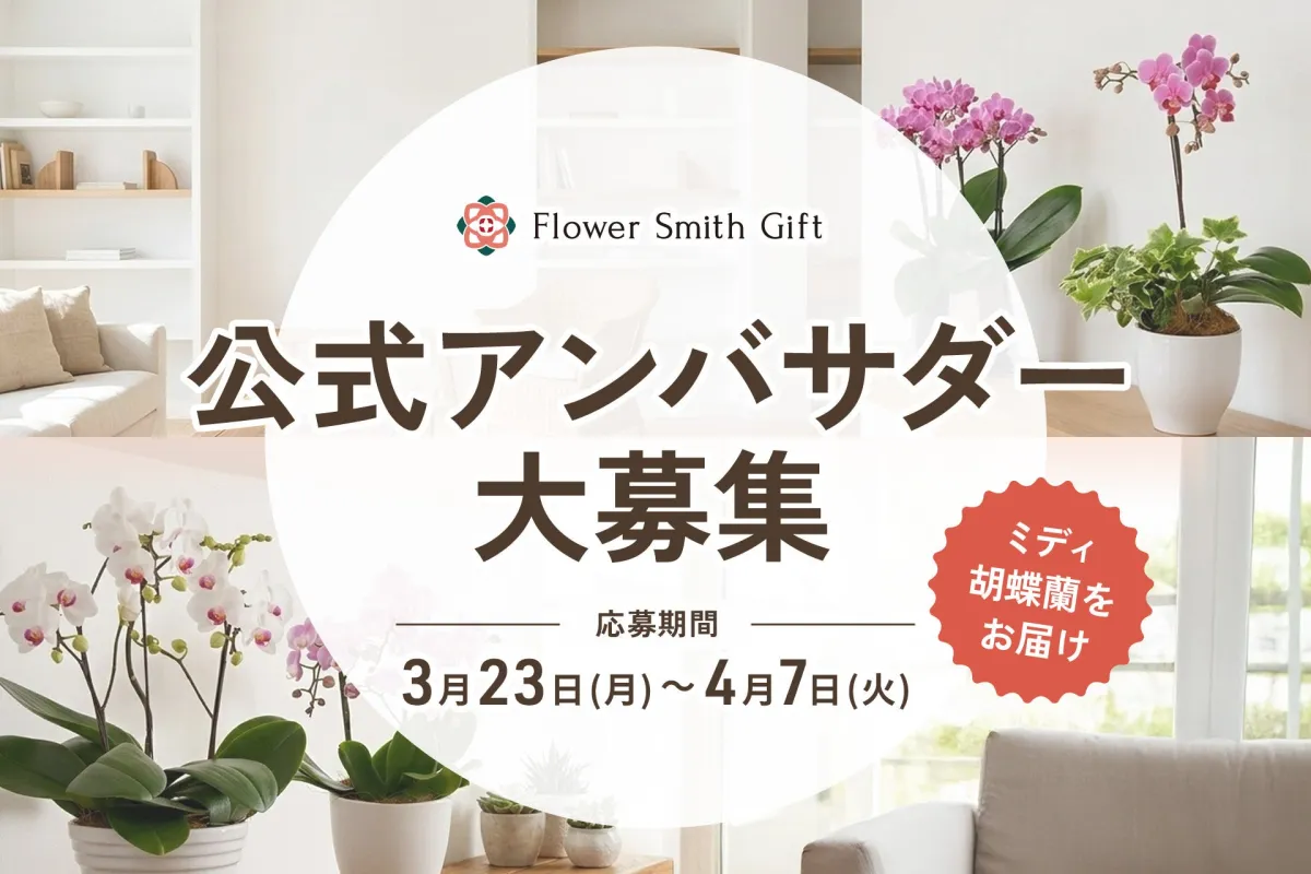 フラワースミスギフトでは、胡蝶蘭の魅力を広めたいと考える仲間を全国から募っています。応募期間は2026年の3月23日から4月7日まで。選ばれた方には、1鉢のミディ胡蝶蘭がプレゼントされます。この機会に、もっと身近な存在として胡蝶蘭を感じてみませんか?