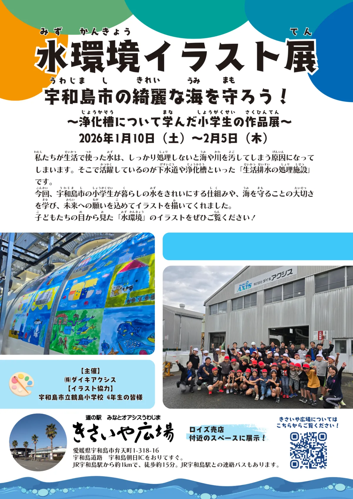 株式会社ダイキアクシスが、愛媛県宇和島市の道の駅「みなとオアシスうわじま」内の「きさいや広場」で、特別なイラスト展を企画します。この展示は、「水環境」をテーマにしたもので、地元の鶴島小学校の4年生が描いた33点の作品を展示する予定です。