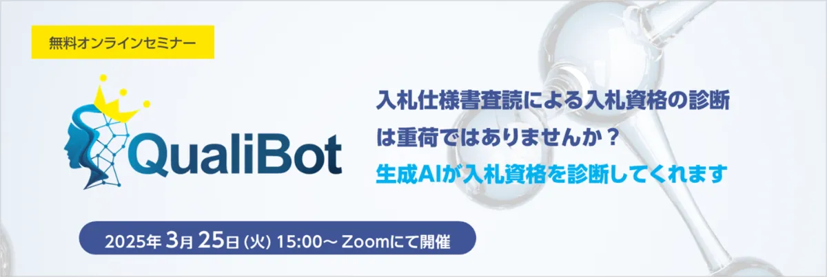 そこで、ニーズウェルは2025年3月25日火曜日の15時から「QualiBot」を活用した無料オンラインセミナーを開催します。本セミナーでは、入札業務における負担を軽減し、効率性や生産性を向上させるための具体的な方法を学べます。