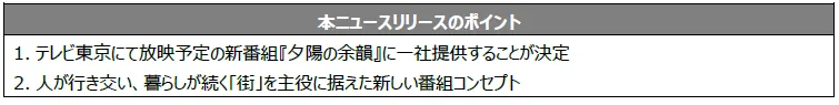 野村不動産ホールディングスが提供する新たなテレビ番組『夕陽の余韻』が、2026年4月からテレビ東京で放送されることが発表されました。この新しい試みは、街の醸し出す独自の魅力や、そこに住む人々の営みを映し出すことで、皆様の日常に寄り添うことを目指しています。