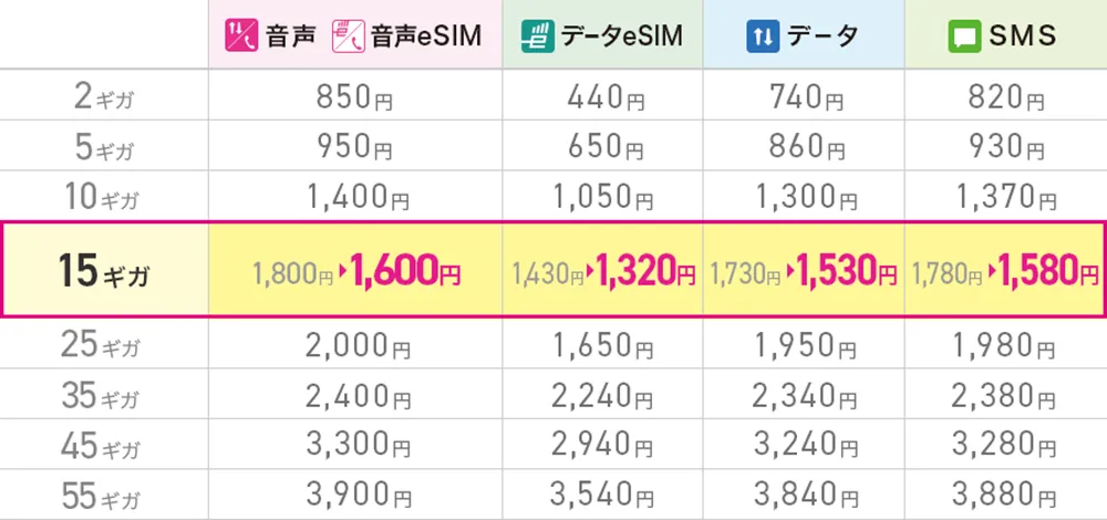 データ増量: キャンペーン期間中に申し込むと、15ギガプランから55ギガプランまでが利用開始月から最大6ヵ月間、10GB増量されます。