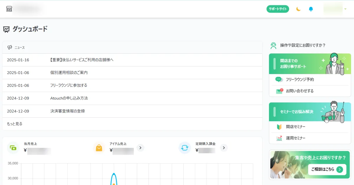 「Atouch」の管理画面には、アイテム登録、売上管理、顧客管理などを行うためのダッシュボードが搭載されています。最近のアップデートでは、このダッシュボードがより直感的に操作できるように改善されました。特に、右側にはお問い合わせ窓口やフリーラウンジが設置されており、疑問点を素早く解消できるようになっています。この利便性の向上により、事業者たちはスムーズにEC運用を行えるでしょう。