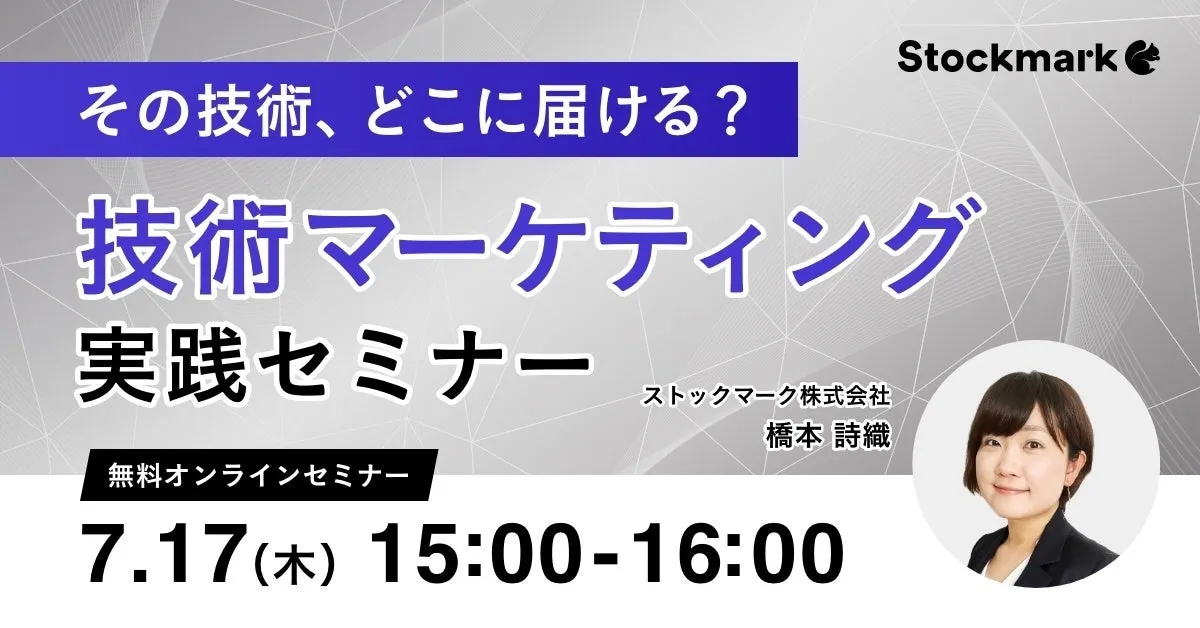 ストックマーク株式会社が主催する「その技術、どこに届ける?技術マーケティング実践セミナー」が、2025年7月17日(木)にオンラインで開催されます。このセミナーは、製造業における技術の市場導入を後押しすることを目的としており、特に研究開発や技術企画に携わる方々に向けて設計されています。