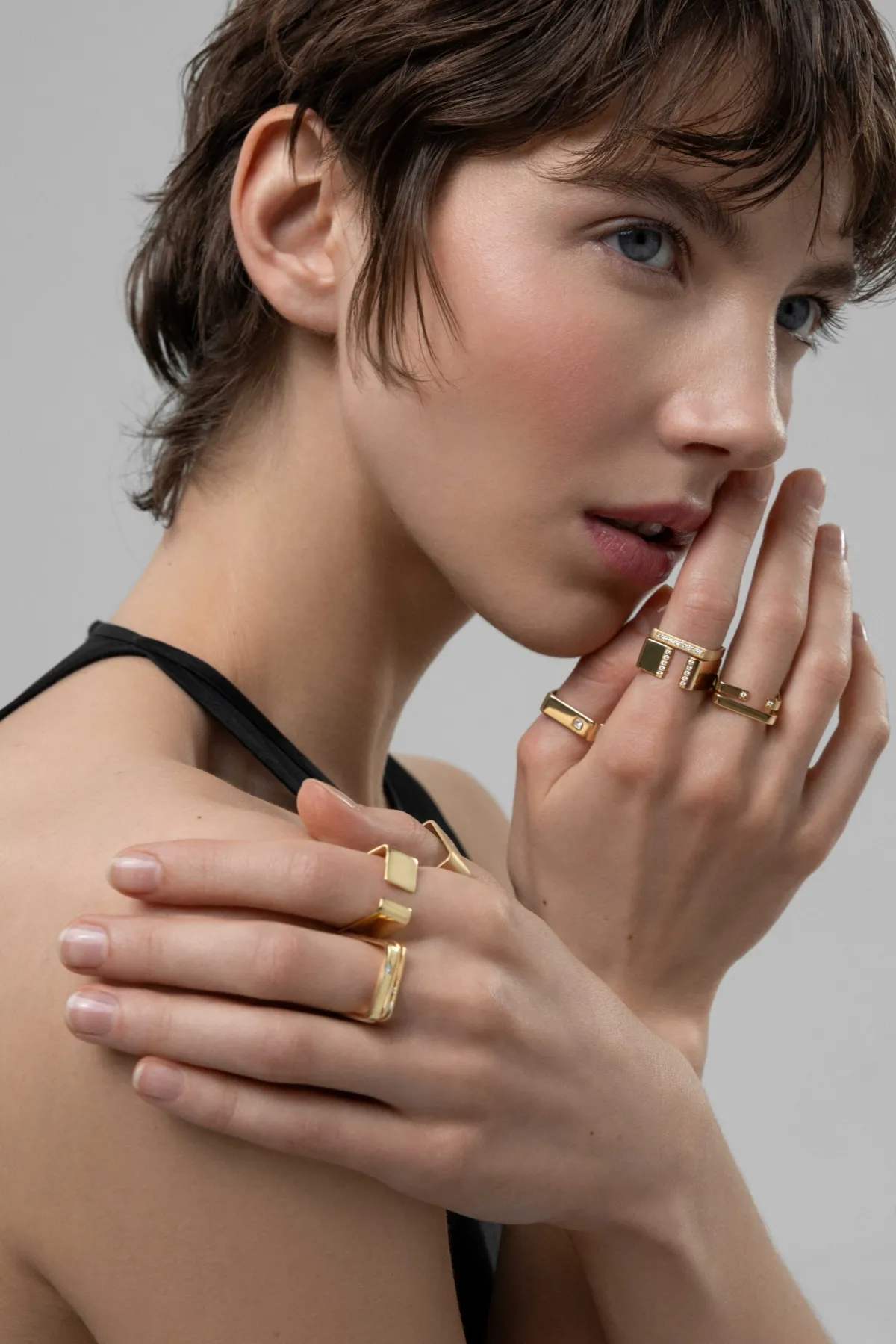 さらに、「QUADRA」の魅力はその造形がもたらすスタッキングの楽しさにあります。単体でも美しいリングが、数を重ねることで新たな表情を生み出します。異なる幅のリングを組み合わせ、独自の形を模索することで、着用者自身のスタイルを創造できます。それは、肌をキャンバスに見立てて自由に空間をデザインすることと等しいのです。