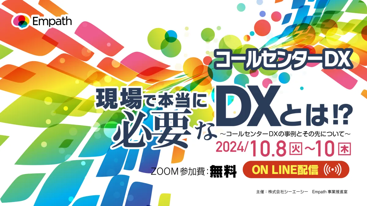 株式会社シーエーシーが主催するオンラインカンファレンス「現場で本当に必要なDXとは!? ~コールセンターDXの事例とその先について~」が、2024年10月8日から10日までの3日間にわたり開催されます。本イベントは、コールセンター業界の最新動向や成功事例を共有する貴重な機会です。東証プライム上場の株式会社CACが提供するこのカンファレンスは、オンライン形式で行われ、全国の参加者が気軽に参加できる環境を整えています。