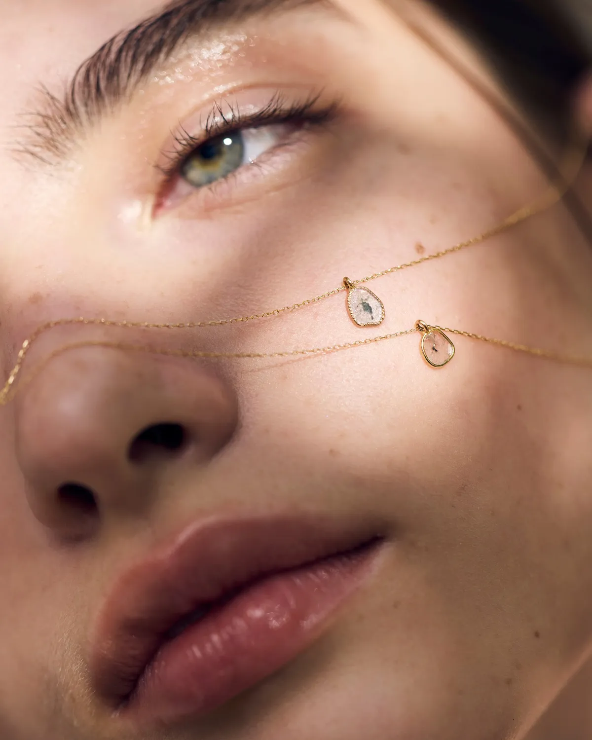 スライスダイヤモンドとは、ダイヤモンドの原石を薄くスライスし、磨き上げたものです。そのため、石の内包物や形状はそれぞれ異なり、一つとして同じものはありません。特にこのコレクションでは、デザイナーが選び抜いた特別なスライスダイヤモンドを使用し、インドの熟練した職人たちが手作業で金で取り巻くことで、ひとしなりの美しさを引き出しています。どのネックレスも、湖に薄く張った氷が太陽の光を受けて輝くかのような、独特のきらめきを放っています。
