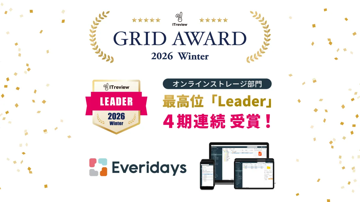 株式会社yettが提供するオンラインストレージサービス「Everidays」が、アイティクラウドが運営するIT製品レビュープラットフォーム「ITreview」において、2026年冬の「ITreview Grid Award」オンラインストレージ部門で「Leader」を4期連続で受賞しました。この快挙は、業界内外を問わず大きな注目を集めています。