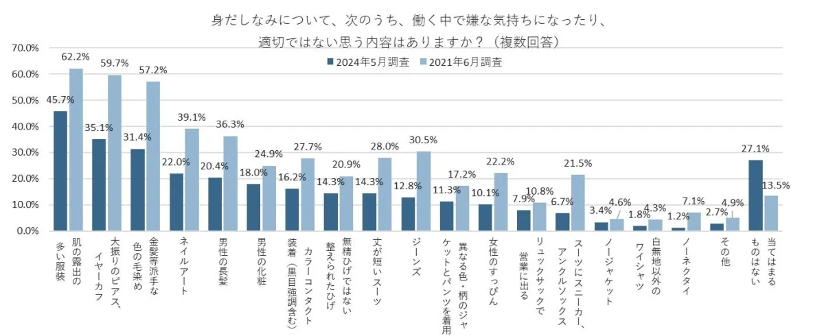 一方で、「当てはまるものはない」と回答した人は27.1%で、2021年の調査と比べて倍増しました。このことから、勤務時の外見に関する意識は全体的に寛容になっていることがうかがえます。