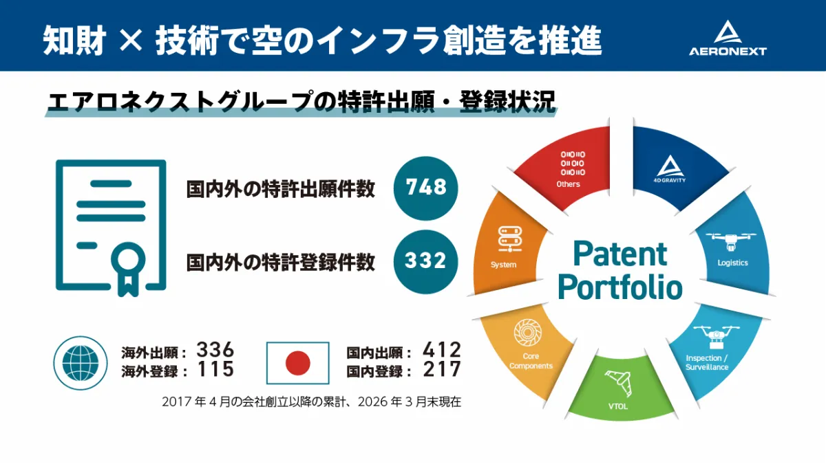 エアロネクストは、自社の産業用ドローンに関する独自技術を特許化し、ライセンスパッケージとして提供しています。2017年の創立以降、748件の特許を国内外で出願しており、その中でも特に物流領域のドローン特許に注力しています。この分野でのスコアは業界でNo.1となり、新たなビジネスモデルとしての確立を目指しています。
