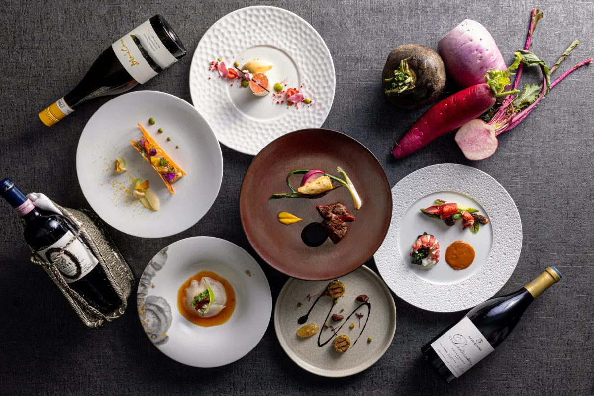 シェフソムリエ江口圭一氏は、料理に合う厳選された4種類のワインを提案しています。横浜のテーマを強調し、世界各地から取り寄せたワインが、料理の味わいを高めるために選ばれました。例えば、フランス製のシャンパーニュ「ラリエ リフレクション R.021」は、料理の洗練された味わいを引き立てるエレガントな一品です。その他にも、日本の春の味覚にぴったりの白ワインたちが、各料理にぴったりと寄り添います。