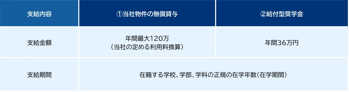 レオパレス21の奨学制度には、2つの支援形態が用意されています。1つは当社物件の無償貸与、もう1つは給付型奨学金です。どちらかを選択し、応募することが可能です。