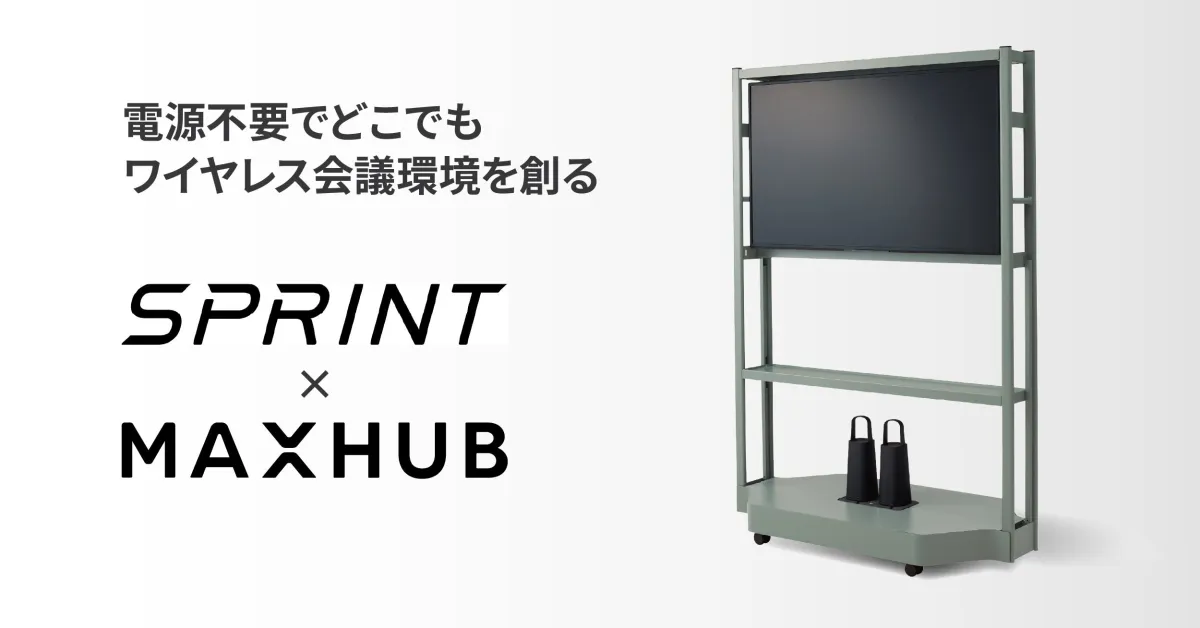 新しい製品は、オカムラの「SPRINT モニタースタンド」とナイスモバイルの「MAXHUB ミラーリングディスプレイⅢ」を組み合わせたパッケージで構成されています。オプションとして、カメラ、マイク、スピーカーなどが揃っており、コミュニケーションに最適な環境を作ります。特に目を引くのが「OCポータブルバッテリー」の併用によって、電源が存在しない場所でも利用できるという点です。