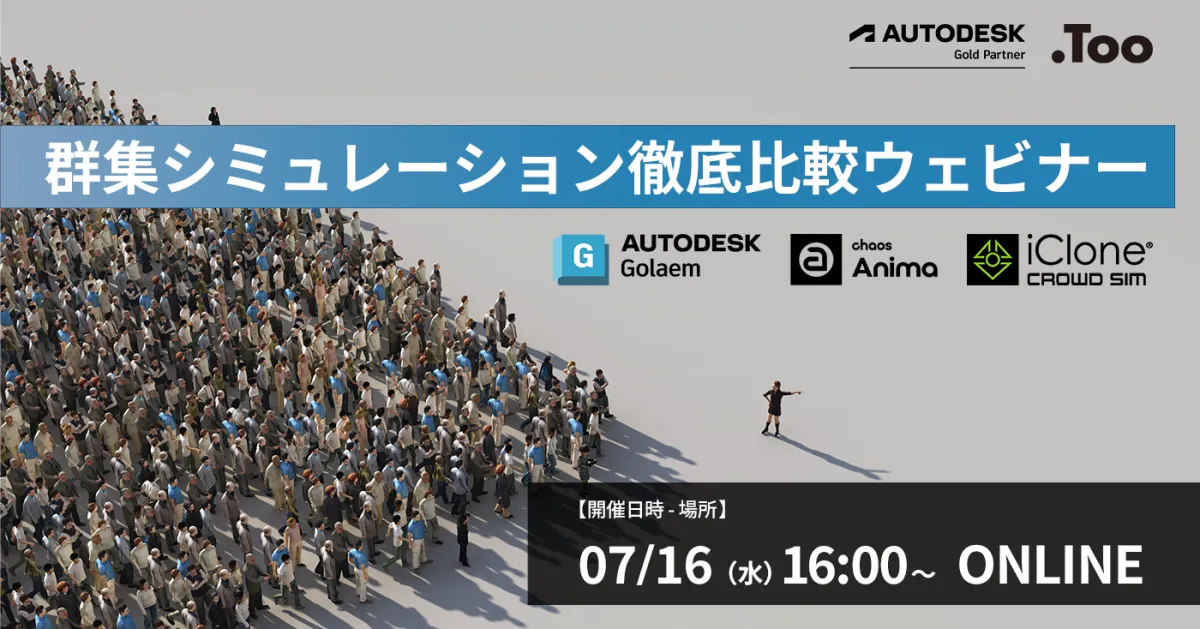 2025年7月16日(水)に、アニメや映像、ゲーム制作に興味がある方々に向けて、株式会社Tooによる「群集シミュレーション徹底比較ウェビナー」が開催されます。このウェビナーでは、注目の群集シミュレーションツールである「Maya Golaem」、「Chaos anima」、「Reallusion Crowd-SIM」の特徴や導入のポイントについて、詳細に解説します。