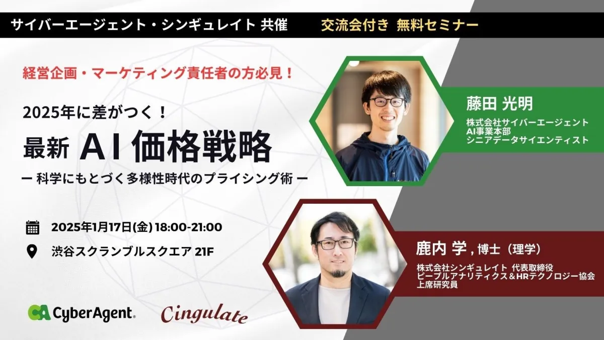 株式会社シンギュレイトと株式会社サイバーエージェントの共催による特別セミナーが2025年1月17日(金)に開催されます。本セミナーは、「2025年に差がつく!最新・AI価格戦略 ー科学にもとづく多様性時代のプライシング術ー」をテーマに、日本のリーディングカンパニーの経営者や専門家による知見を活かした内容です。セミナー会場は東京都渋谷区の渋谷スクランブルスクエアで行われ、参加者同士の交流も含めた貴重な機会を提供します。入場は無料ですが、定員は先着70名となっております。