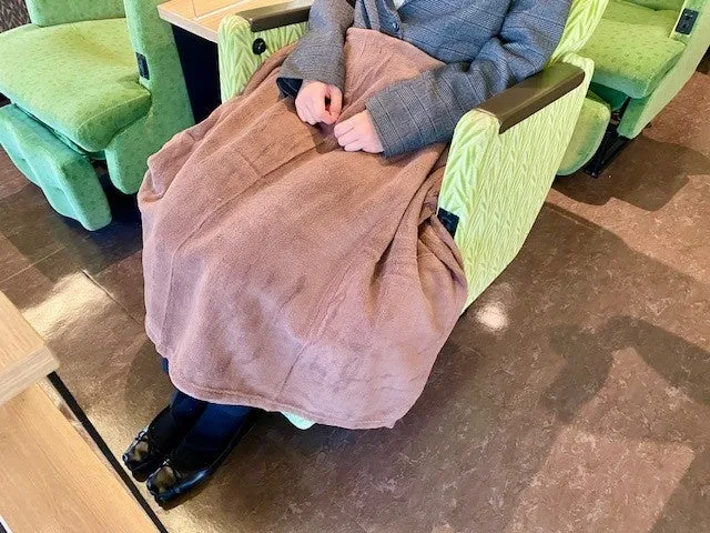 貸出される毛布は100×140cmで、体をしっかりと包み込む十分なサイズです。膝にかけたり、広げて羽織ったりと、様々な使い方ができ、非常に便利です。