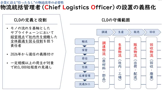 政府もこの問題を重く受け止め、2023年10月には「物流革新緊急パッケージ」を発表。CLOの選任を義務付ける施策が提案され、対象となる荷主企業は約3,000社から5,000社に及ぶと見込まれています。これにより、物流管理の高度化が求められる中で、CLOとしての役割を担う経営者の活躍が期待されています。