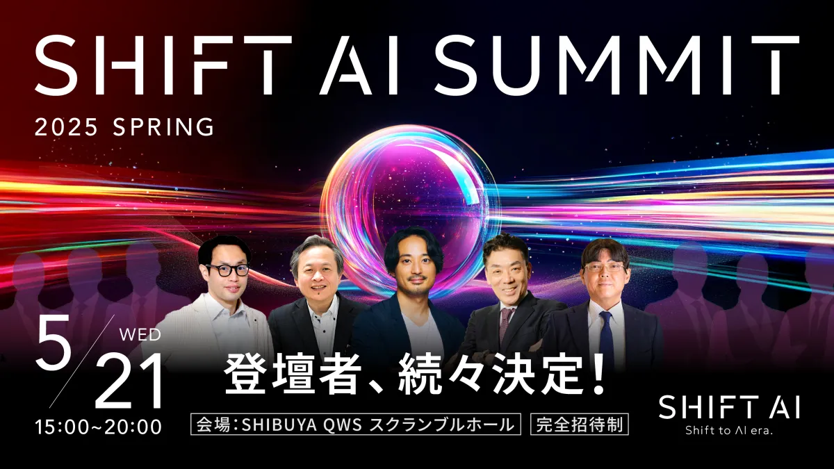 2025年5月21日(水)、株式会社SHIFT AIが主催する「SHIFT AI Summit 2025 Spring」が開催されます。今年のテーマは「SHIFT to AI」です。このイベントは、生成AIとデジタルトランスフォーメーション(DX)の推進が企業の成長に与える影響を探求することを目的としています。