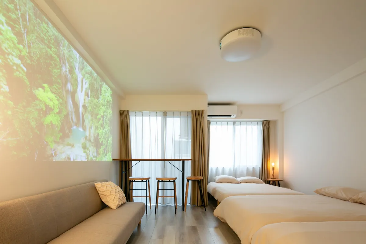 全室に設置されている「Aladdin」のプロジェクター一体型ライトが特徴です。この設備により、壁一面が映画館のスクリーンに早変わりし、旅行者は自分だけのプライベート映画館でリラックスできます。お気に入りの映画や音楽に浸る贅沢なひとときが約束されています。