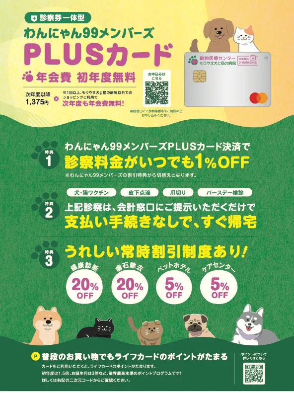 「わんにゃん99メンバーズPLUSカード」を持つことで、様々な特典が受けられる。まず、このカードを使うことで、診察料金がいつでも1%オフとなる。たとえば、ワクチン接種や狂犬病予防接種、さらには皮下点滴や爪切りといった特定のメニューについては、会計窓口でカードを提示するだけで、支払い手続きなしですぐに帰宅できる。これなら急いでいるときも、手間を省くことができて非常に便利だ。
