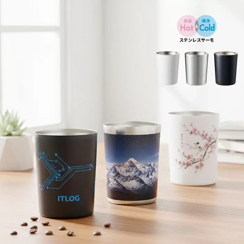 新ステンレスタンブラーは、260mlというコンパクトなサイズ。コンビニコーヒーやスティックコーヒーにもぴったりで、テイクアウトカップもそのまま入れられるカップホルダー仕様です。1個からのオーダーが可能なので、小ロットのノベルティや記念品、さらにはオーダーメイドの贈り物にも対応しています。