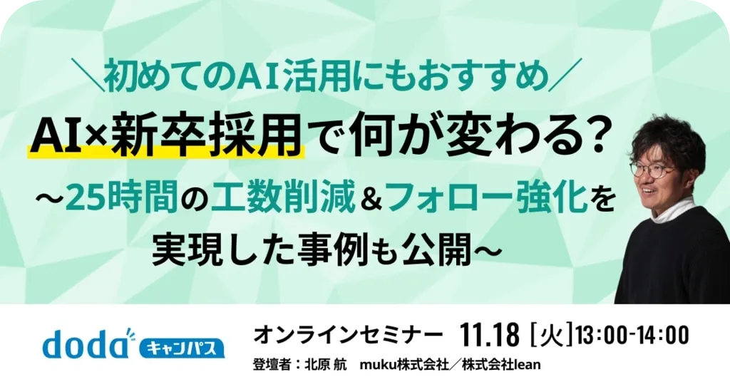 2025年11月18日、株式会社ベネッセi-キャリアが主催するオンラインセミナー「AIを活用した新卒採用の最新トレンド」にて、株式会社Leanのファウンダー北原航氏が登壇します。このセミナーは、新卒採用を担う企業の採用担当者を対象に、AIを駆使することでの工数削減と学生フォローの強化をテーマにしています。