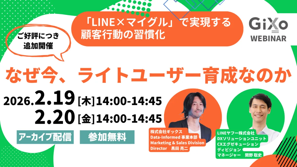 株式会社ギックスが主催するウェビナー「なぜ今、ライトユーザー育成なのか―「LINE×マイグル」で実現する顧客行動の習慣化―」が、2026年2月19日と20日にオンラインで開催されます。前回好評のセミナーを基にしたアーカイブ配信となるこのイベントでは、LINEヤフーから関野氏をゲストに迎え、生活者に広く使われているLINEと、ギックスの習慣化促進プラットフォーム「マイグル」の組み合わせがもたらす効果について深掘りしていきます。