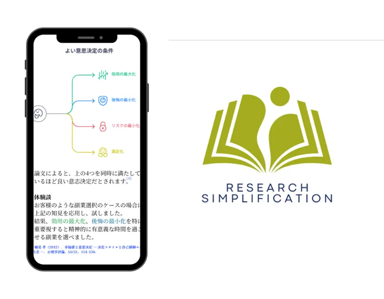 「Research Simply」は、「論文の世界をコンビニ感覚で」という独自のテーマを持ち、難解な研究論文を、仕事や日常生活で使える形式に変換するサービスです。このサービスは主に以下の工程を経て、学びやすいコンテンツを提供します。