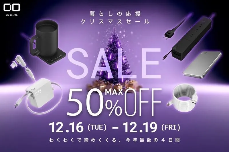 株式会社CIOがAmazonにて待望の「Amazon 暮らしの応援クリスマスSALE」を開催いたします。このセールは2025年12月16日の火曜日から19日金曜日まで行われ、最新のスマートフォンやパソコンに最適な充電ガジェットを最大50%オフでご提供します。