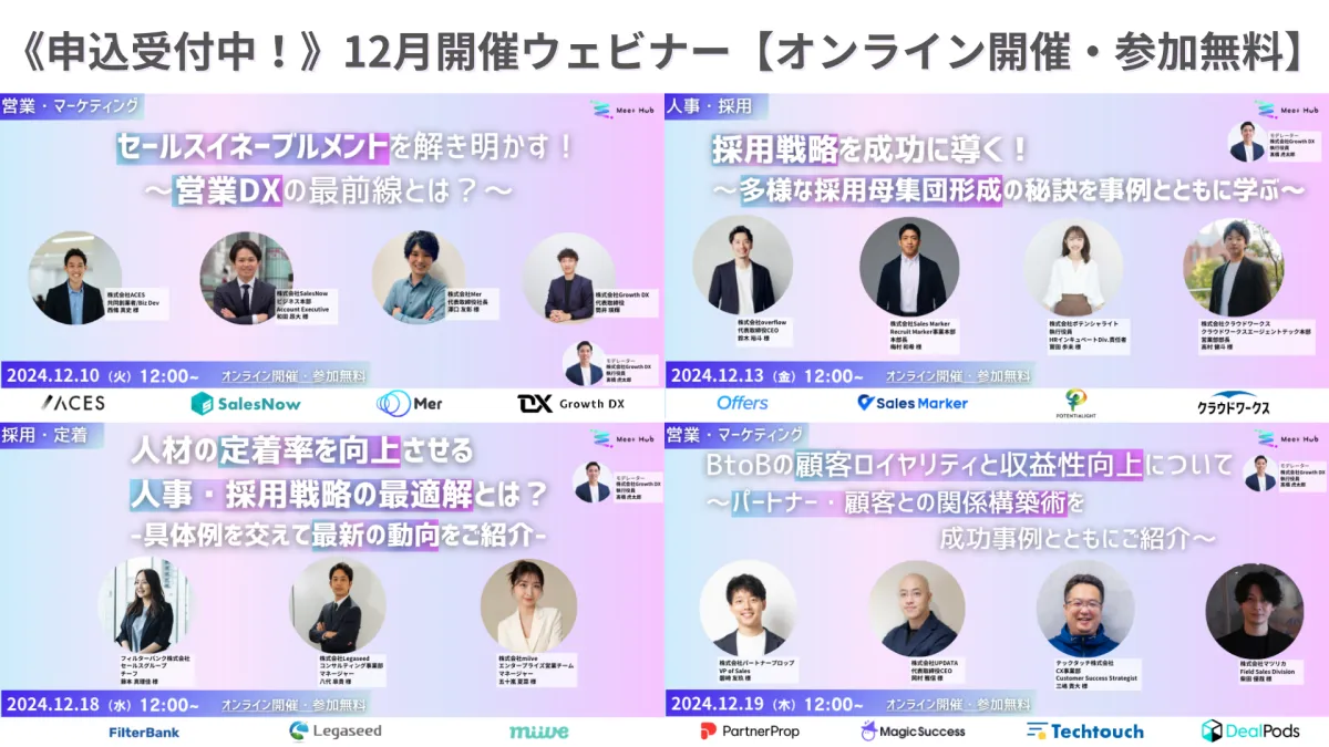 2024年12月に開催される、業務効率化と課題解決に向けたウェビナー情報が公開されました。このウェビナーは、BtoBビジネスマッチングサービス『Meet Hub』を運営する株式会社Growth DXが主催し、参加は無料でオンラインにて行われます。
