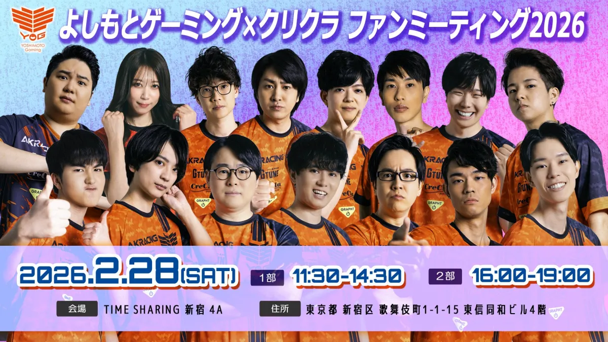 このファンミーティングは、2026年2月28日(土)に新宿で行われます。2部制になっており、第一部は11:30から、第二部は16:00からスタートします。参加者は約200名を予定しており、クリクラを契約した人や応募フォームから当選した方が対象です。イベントでは、よしもとゲーミングの選手16名が参加し、トークやビンゴゲームなど、ファンが楽しめる様々なプログラムが用意されています。