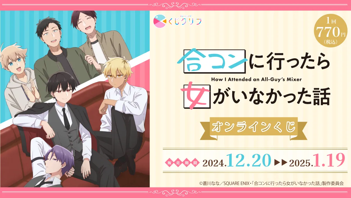 株式会社サトクリフは、人気のTVアニメ「合コンに行ったら女がいなかった話」のオンラインくじを2024年12月20日(金)10時より販売開始します。このくじは、視聴者の期待を裏切らない魅力的な商品ラインナップを用意しており、多くのファンに楽しんでもらえる内容となっています。