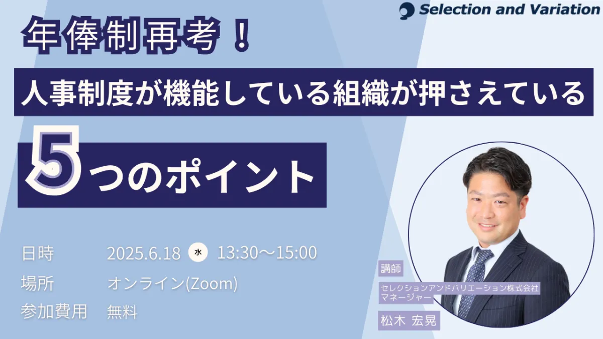 セレクションアンドバリエーション株式会社は、2025年6月18日(水)にオンラインセミナーを開催予定です。テーマは「年俸制再考!人事制度が機能している組織が押さえている5つのポイント」で、参加費は無料。現実に機能する人事制度の運用に興味がある企業や人事担当者にとって、非常に有益なセミナーになること請け合いです。