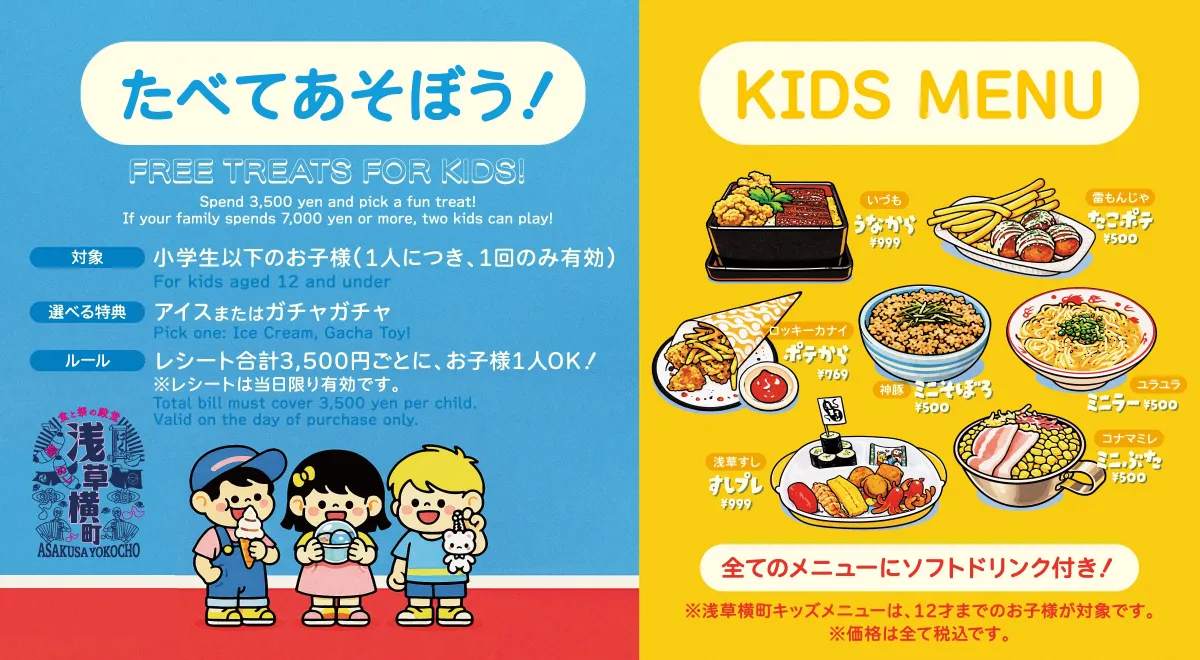 すべての店舗で楽しめる専用メニューが登場。お子様が喜ぶメニューが揃い、家族みんなで楽しい食事時間を過ごせます。例えば、雷もんじゃでは「たこ焼き&ポテトセット」が500円、浅草いづもの「ウナからセット」が999円、ユラユラの「ミニラーメンセット」も500円で楽しめます。