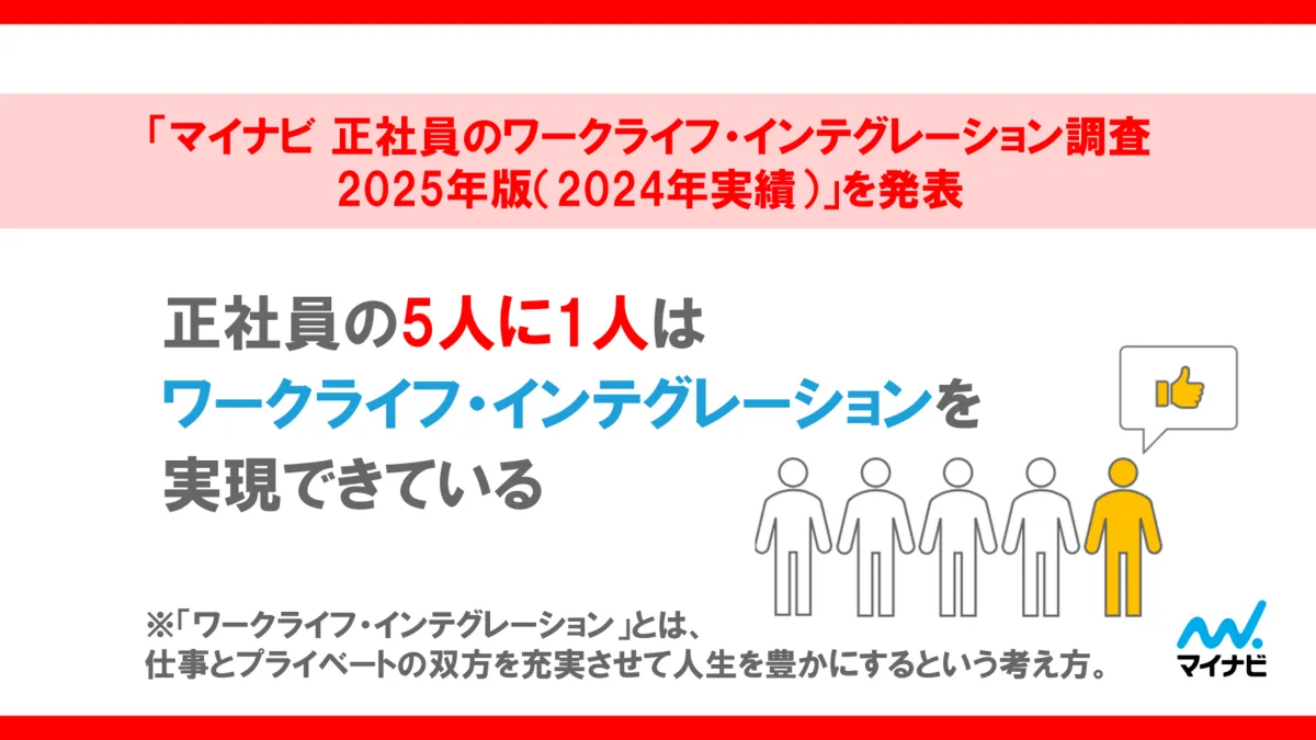 株式会社マイナビが、20歳から59歳の正社員を対象に実施した「正社員のワークライフ・インテグレーション調査2025年版(2024年実績)」の結果を発表しました。この調査は、仕事と私生活をいかに充実させることができるかを探り、特に「ワークライフ・インテグレーション」と呼ばれる、新しいライフスタイルの考え方について分析したものです。