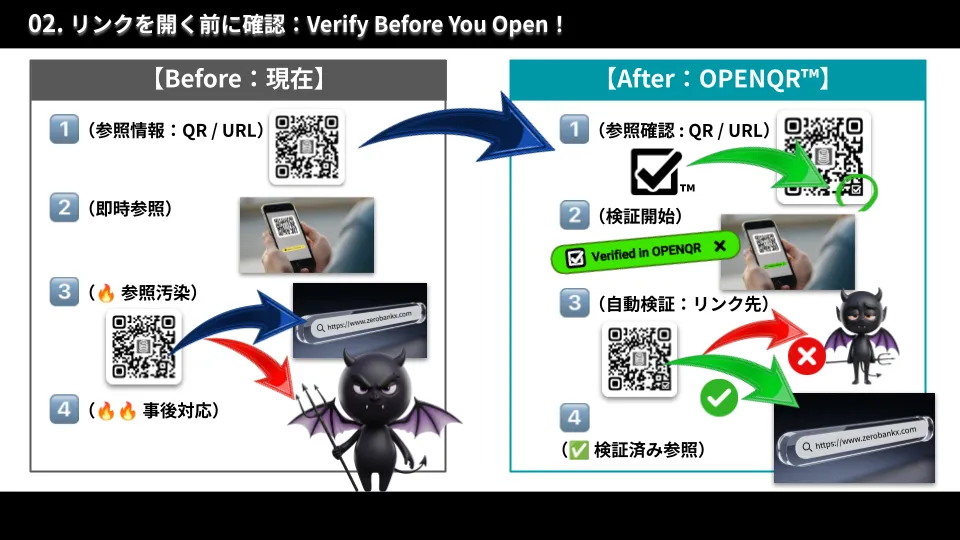 QRコードやURLリンクは、学校や行政、医療、物流など、様々な現場で活用されています。しかし、従来の方式では「開いてから判断する」という姿勢が根付いており、万が一の事故が発生した場合には事後対応が求められる運用がほとんどでした。就実小学校は、事故を未然に防ぐために、「事故が起きる前に構造で止める」という新たなアプローチを採用しました。